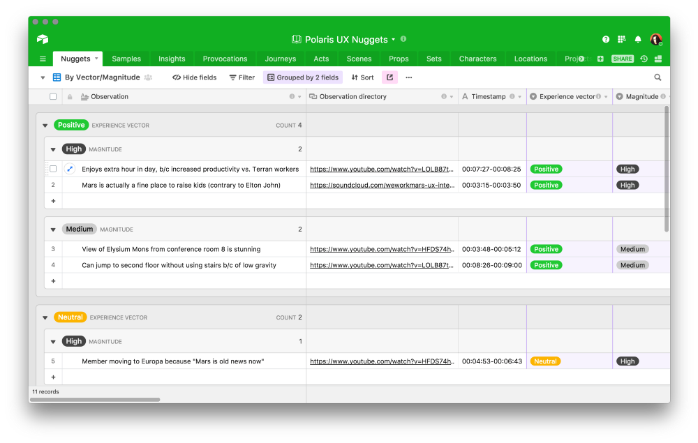 A form in Airtable that WeWork team members can use to submit research observations to Polaris. Each observation is then categorized according to an “experience vector,” an emotion, as well as where it occurred in the user journey.
