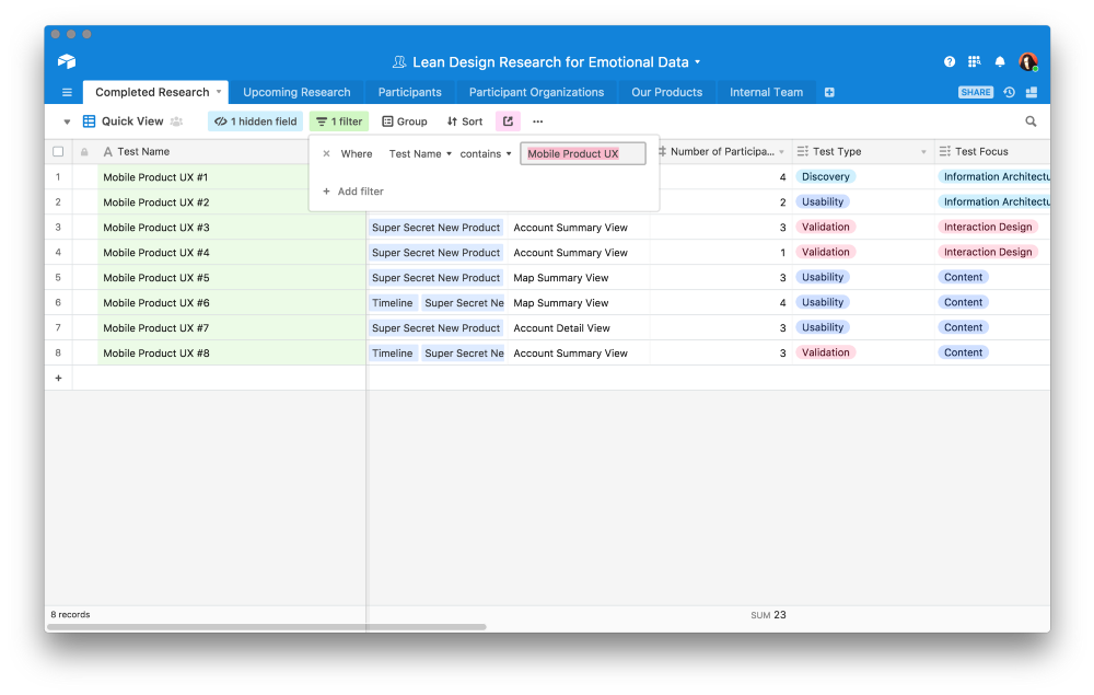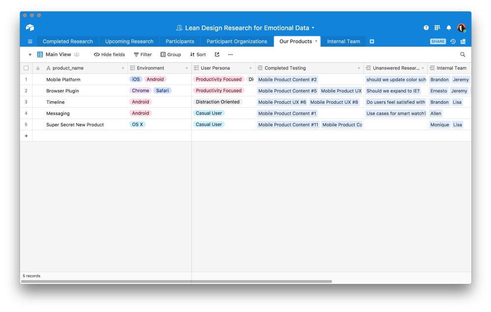 To organize, quantify, and evaluate this emotional data, Sarah put together the following base in Airtable. Research initiatives for each of Accela’s products are logged into a single base. Each table of the base contains information about participants, organizations Accela collaborates with, products, team members, and the results of research tests.