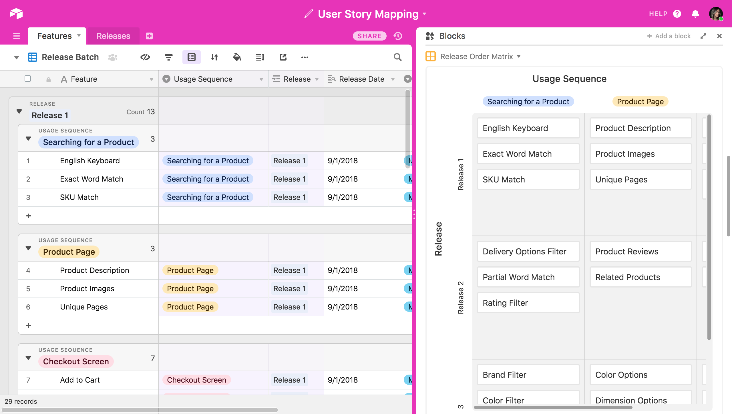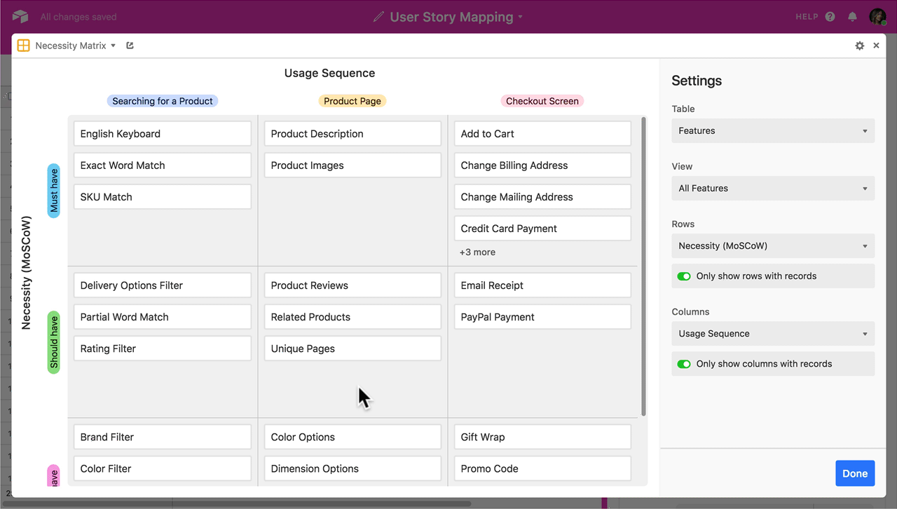 You can take this a step further by actually defining which features will be completed for which releases. Try making a table of releases, then use a linked record field to link features to releases. (Generally speaking, the must-have features should be in your earlier releases, with should-haves and could-haves coming after that.) Then, you can make a separate planning matrix in which the rows are specifically defined by the different releases, rather than by their necessity per se.