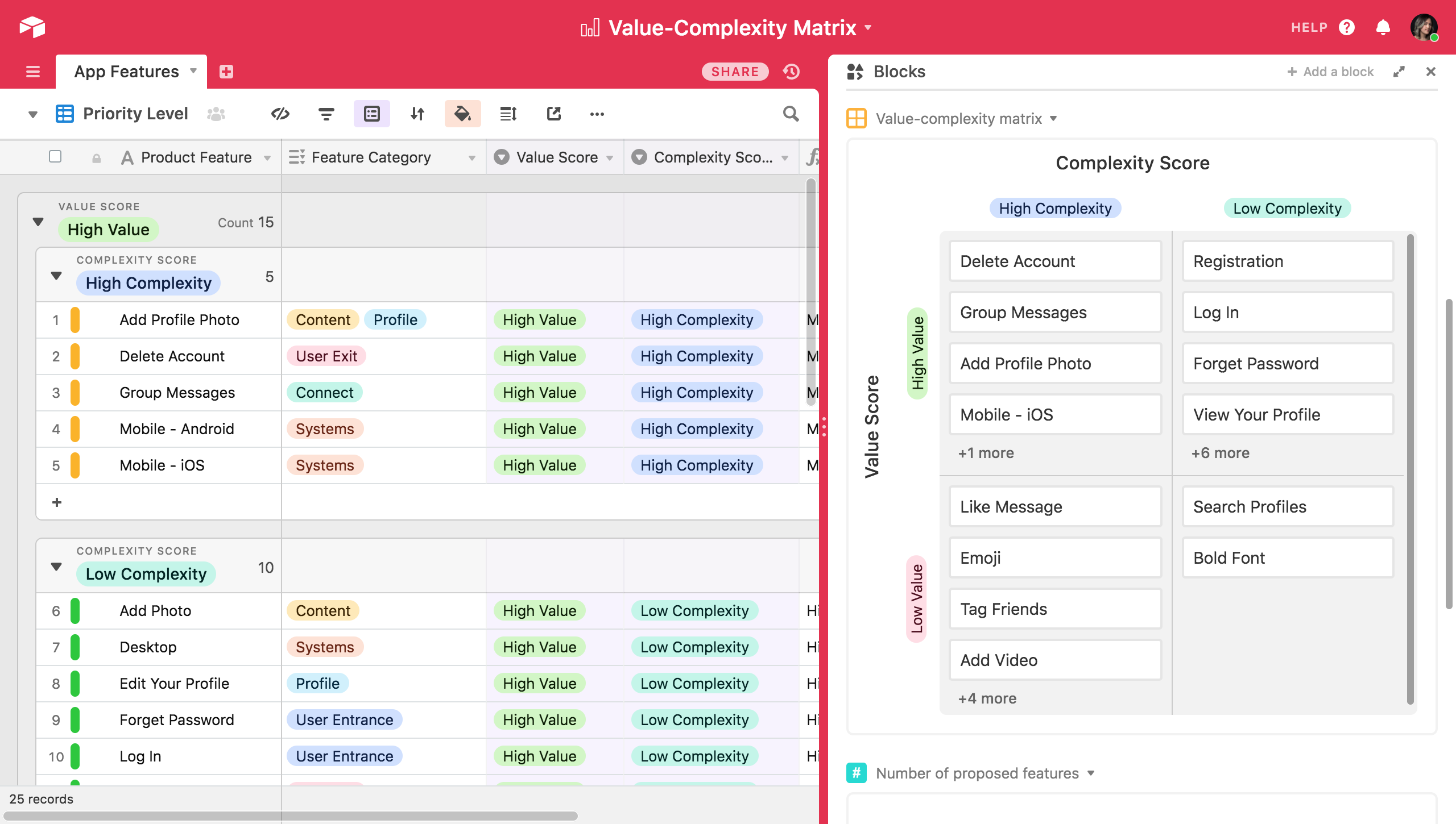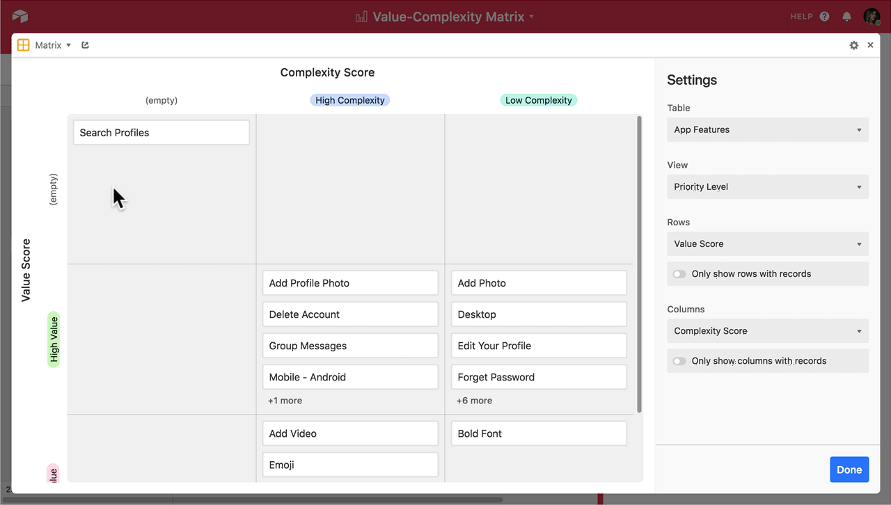 A matrix is a simple product management tool you can use to visualize each potential feature in the context of all the other potential features you could develop. If you're already managing lists of feature requests and user stories in Airtable, the latest addition to the Airtable Blocks platform—the matrix block—allows you to automatically create a prioritization matrix from your existing information.