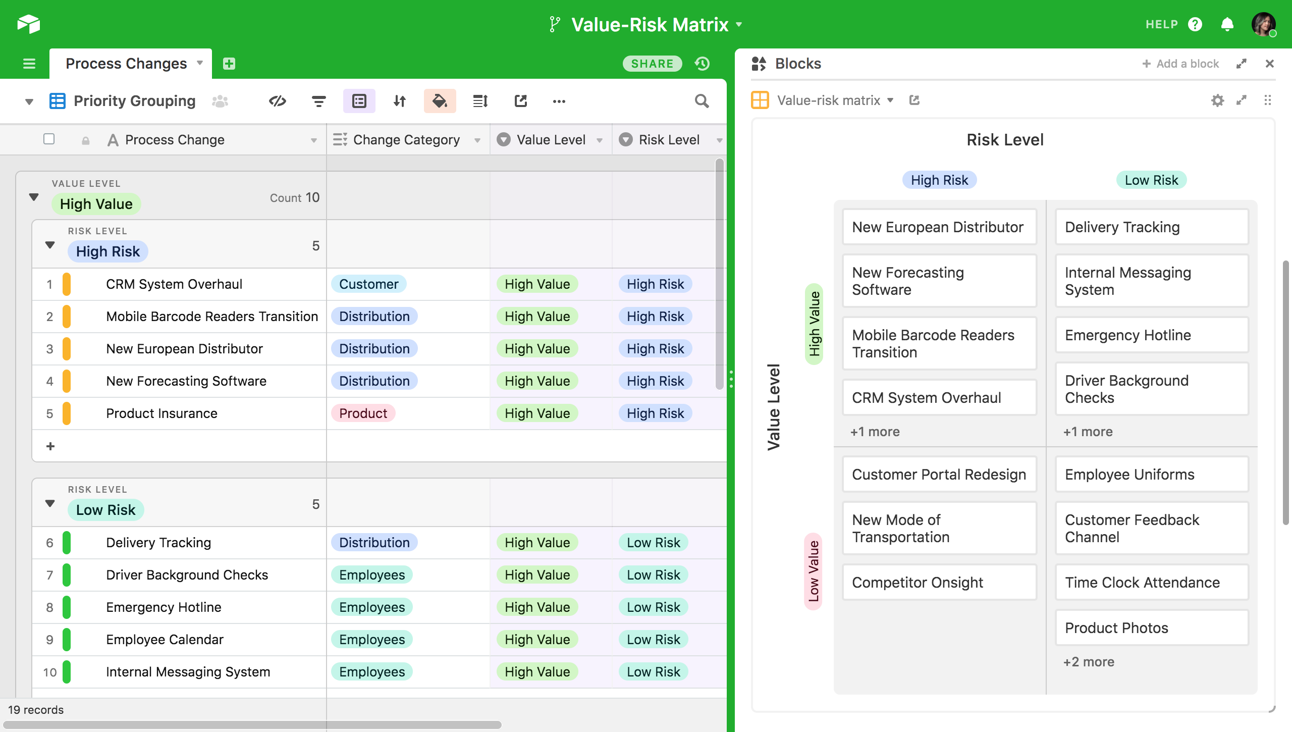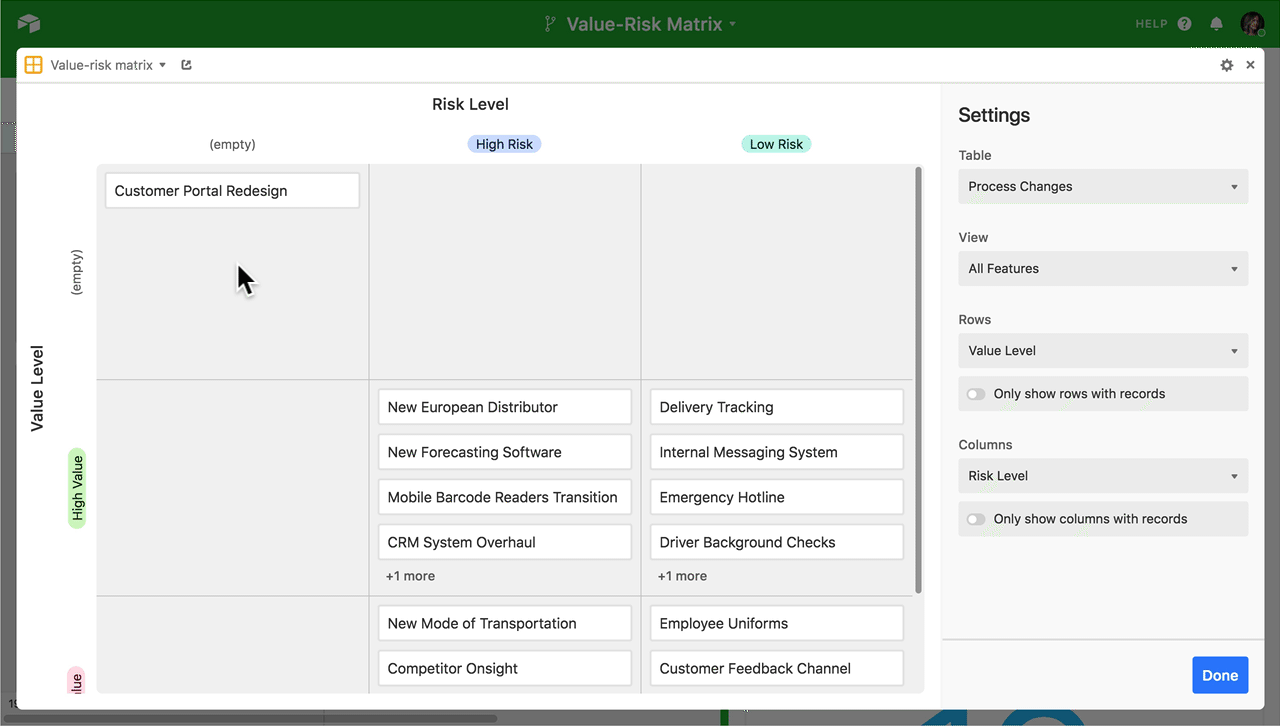 The simplest type of value-risk matrix is a 2x2 grid of quadrants: the value for a given project can be either low or high, and the risk for a given project can be either low or high. To make this sort of matrix for your own team, start from a table of potential new features, products, opportunities, or initiatives, and make two single select fields for value and risk.