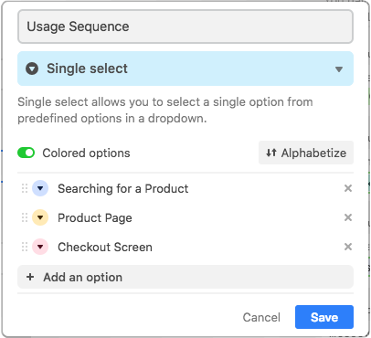 Then, make a single select field called Usage Sequence with dropdown options for each of the steps in your usage sequence. For example, if your product is an online storefront, the activities in your usage sequence might include “searching for a product,” “product page,” and “checkout screen.” This field will be your matrix's X-axis—the one you use to define the columns of the matrix.