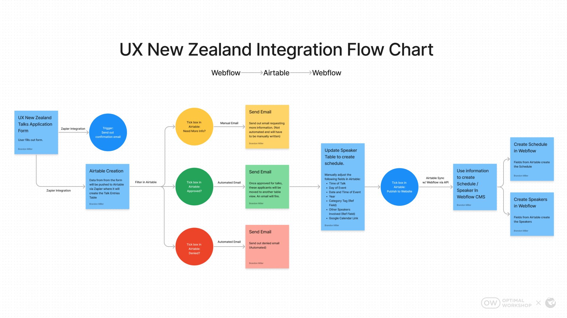 For another event, UX New Zealand, Psychoactive again built a self-service experience for user research company Optimal Workshop, which hosts the UX conference every year. This time, Miller and team didn’t even have to use a Zapier integration to connect the base to Webflow. They simply synced records between Webflow and Airtable using the Nobull Airtable App, and voila!—assets like blogs, speakers, and the schedule, from Webflow synced up with the Airtable base, complete with tags, categories, and even color coding.