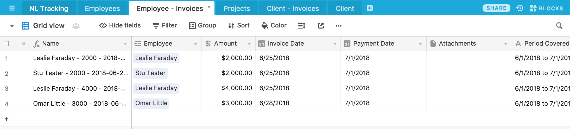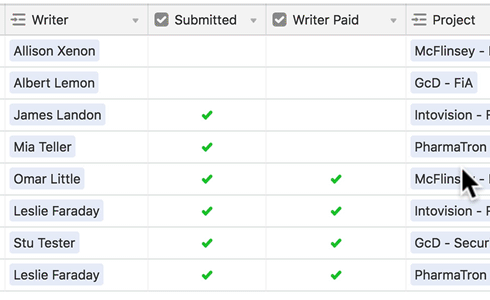 To handle the next step—paying the writers for the work they've done—Roy has another table in the same Airtable base that collects all of the information he needs to finish his invoices: