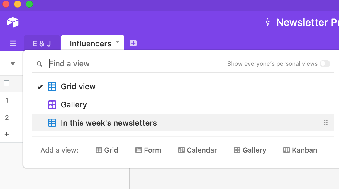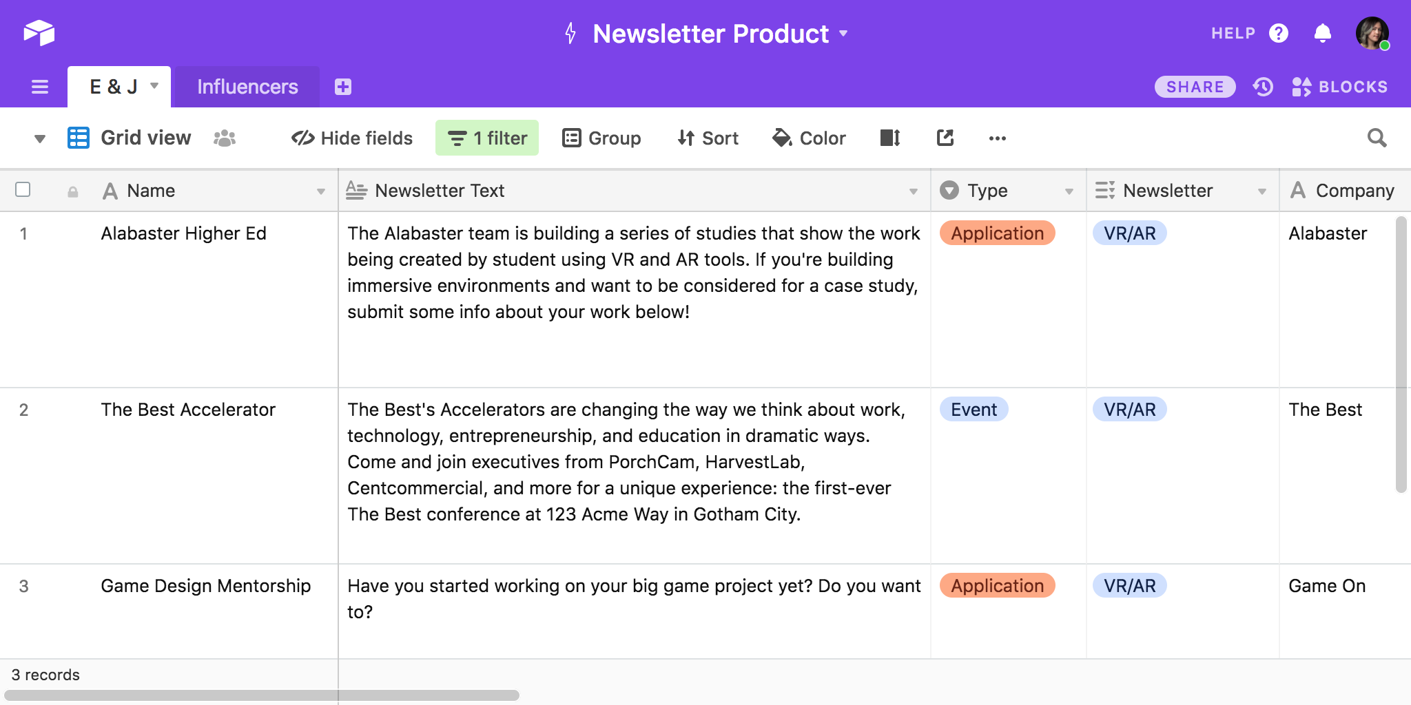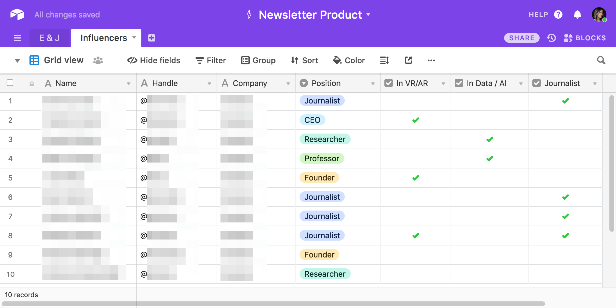 To manage these, Roy and his client assembled a list of influencers, then Roy added those to the content product Airtable base with flags for subject matter inclusion, allowing his team to tailor the influencers contacted to the topics actually being covered in a particular newsletter.