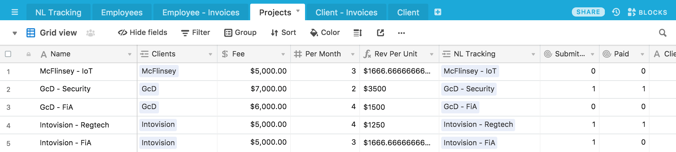 Running this all out of Airtable brings Roy a lot of other side benefits. He can easily get a glimpse of each individual project and see exactly how much working product it entails, how much revenue it brings in, and how important it is to the business overall.