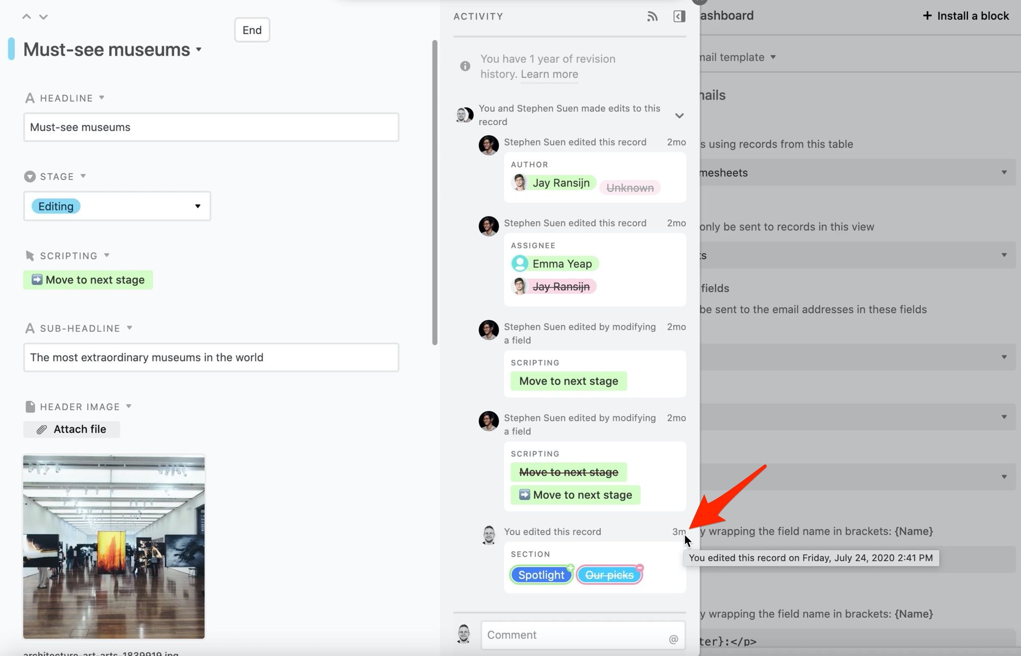 You can also use this activity pane to @mention collaborators right within the record. It’s a great way to keep relevant communication in Airtable.