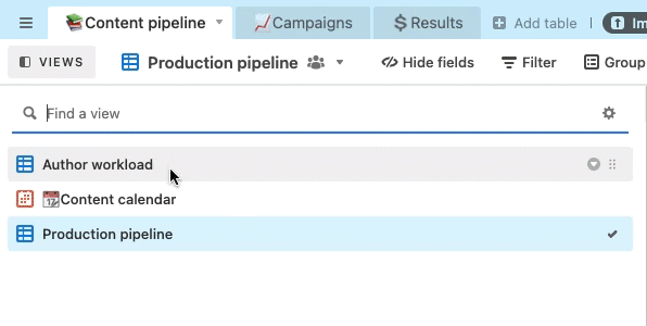 If your base has many views, try the view search bar. When you click the dropdown arrow for the view switcher, you can enter a search term to find the view you are looking for.