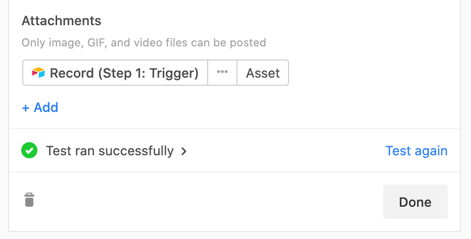 There’s also an optional “Attachments” section of the Post tweet action. If you chose to add an attachment field earlier, you can insert that field in this section by clicking the “+ Add” option, selecting “Record (from Step 1),” and then selecting “Asset” (or whatever you named your attachment field).