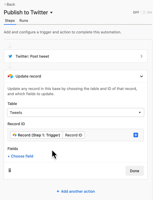 Click the “+ Add another action” button underneath your Post tweet action, then select the “Airtable: Update record →” action from the menu.