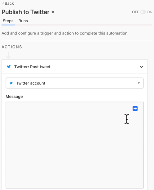 The “Message” section of the Post tweet action includes the text of the tweet you’d like to send. We could insert static text if we wanted, but in this case, we want the body of the tweet to be comprised of the text from the “Copy” field. In order to set this up, click the blue + button—this allows you to insert variables from the trigger step.