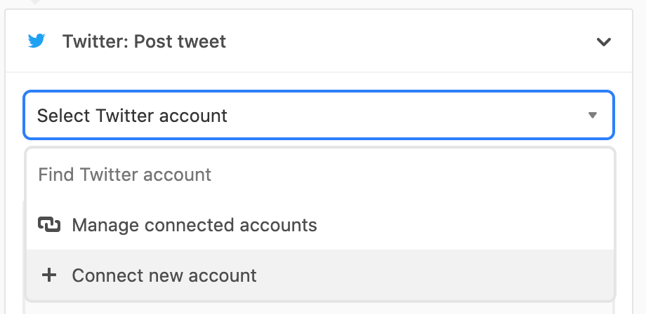 Click the “+ Add action” button. A menu will appear with a wide variety of potential actions. Select the “Twitter: Post tweet →” option. Next, you’ll need to select the Twitter account from which you’d like to post. If you haven’t connected a Twitter account before, you’ll need to authorize Airtable Automations in order to connect your account.