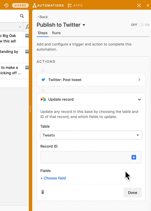 From there, you’ll need to pick the table that contains the records you’d like to update, which in this case is the same “Tweets” table where your tweets all live.