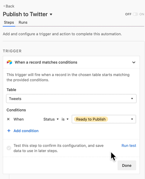 Make sure to run a test to ensure that everything is in order. If the test runs successfully, the automation will update the status of the tweet in the test data from step 1 from “Ready to Publish” to “Posted.” If everything looks good, click the “Done” button when you’re finished.