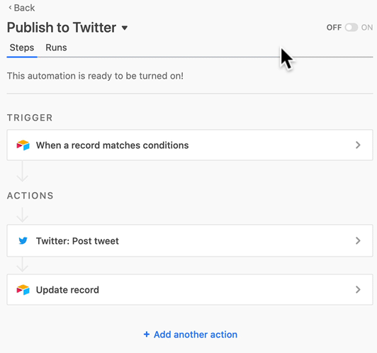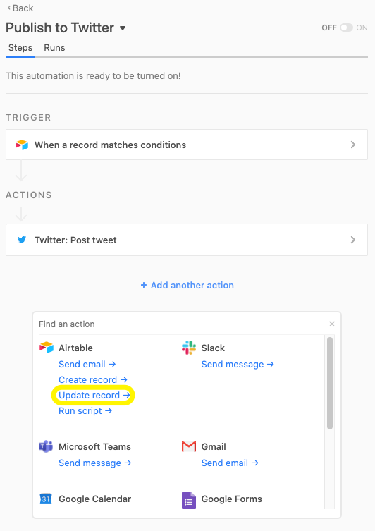 Once you’ve tweeted out your post, it only makes sense for the status of the associated record to change from “Ready to Publish” to “Posted,” so let’s add a second action that will do this for you automatically.