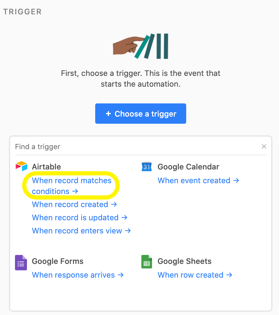 Click the “+ Choose a trigger” button. A menu will appear with a wide variety of potential triggers. Since we want this automation to trigger when one of our tweets matches a specific condition—in this case, when, when a tweet has been marked as “Ready to Publish”—select the “Airtable: When record matches conditions →” trigger.