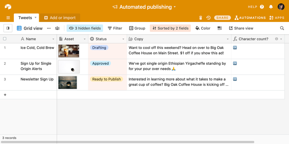 In your Airtable base, you should have a table (called “Tweets,” or something similar) which includes the posts that you’re going to tweet out.