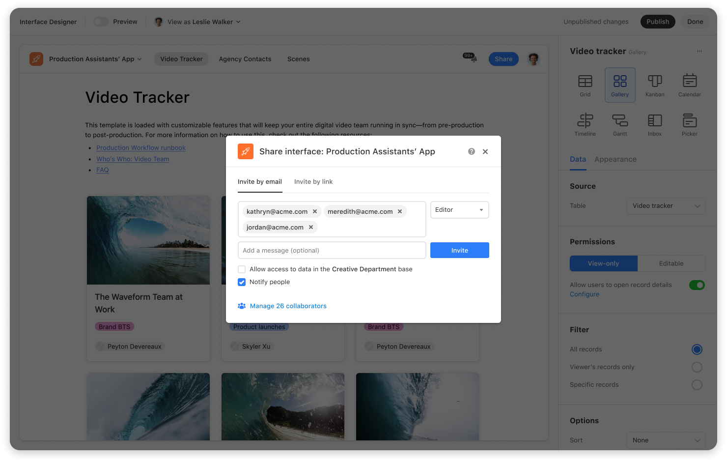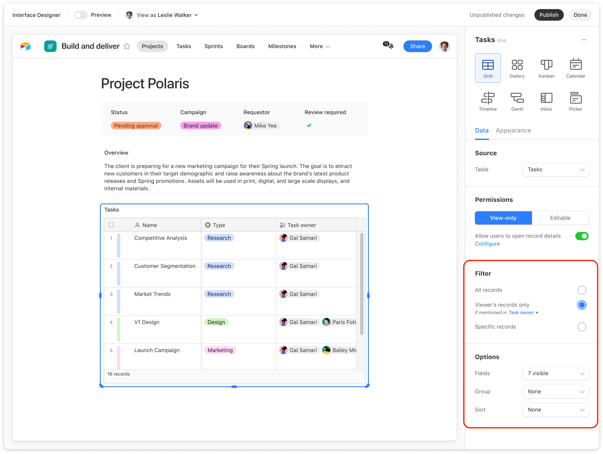 Say you’re on a marketing team, and you need to give your cross-functional sales partners a high-level update on your campaign progress. You can share read-only access to your campaigns interface—without giving them access to everything in your marketing team base. Your partners have the info they need; your sensitive data is safe from unwanted edits.