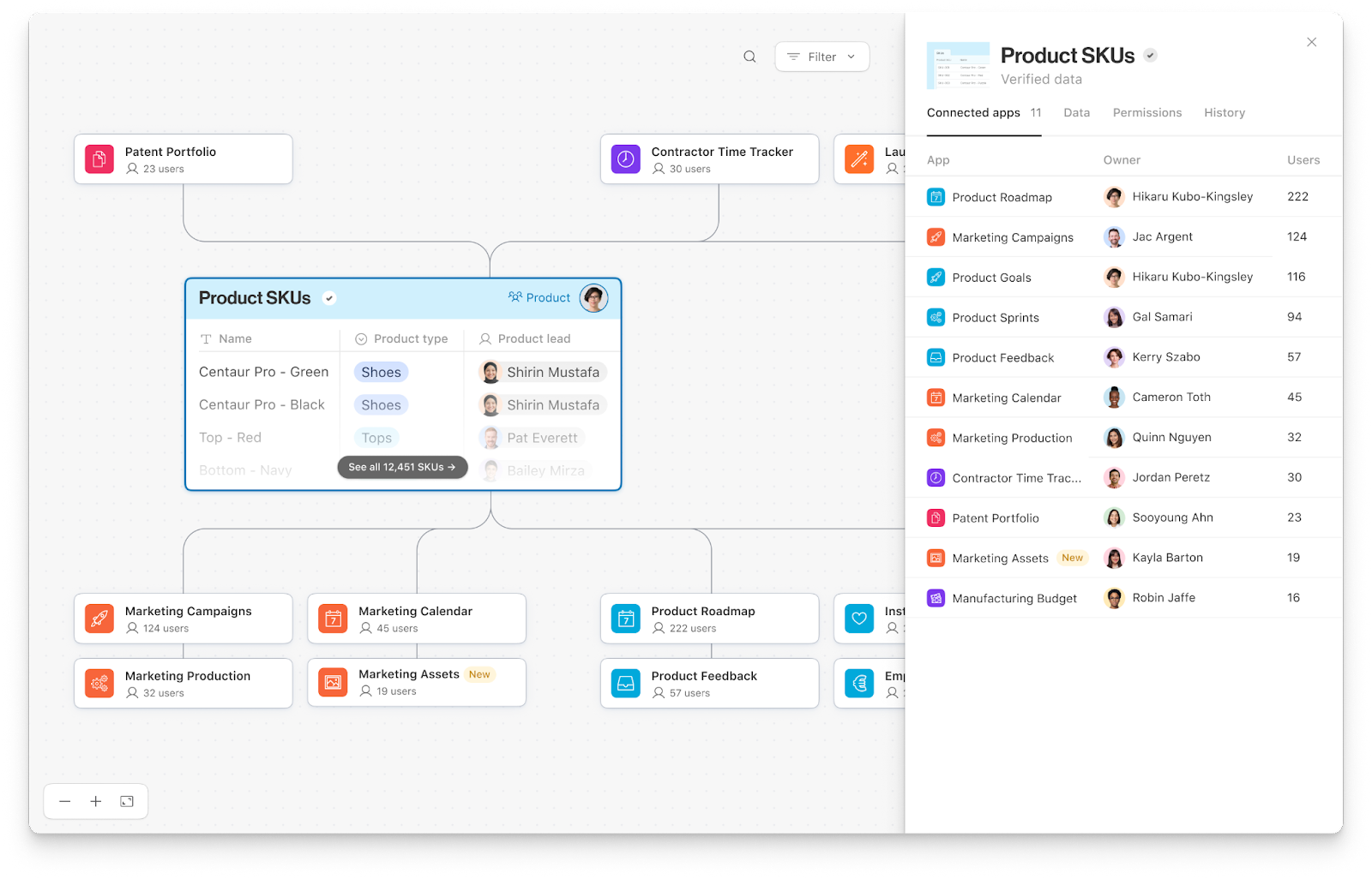 Organizations build bespoke apps for specific needs, but even separate lanes of work are often deeply interconnected. Unfortunately, the most important data—the data that many teams or projects rely on—can be hard to identify and access.