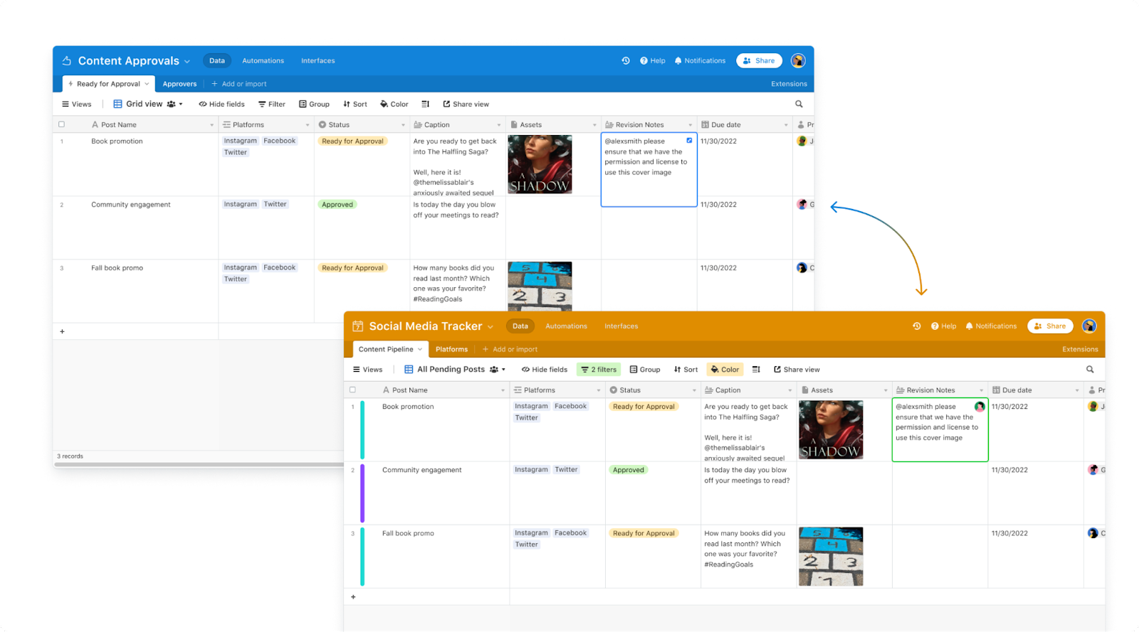Let’s say you're a content team responsible for promoting your publisher's upcoming book releases. You can now sync your content approvals app with your social media tracker, so your social team knows exactly when something is ready to post. And, if your social media manager adds thoughts or feedback on an asset from the social tracker, it'll show up directly in your content approvals base. That way, everyone knows exactly which assets are ready to go live, and when.