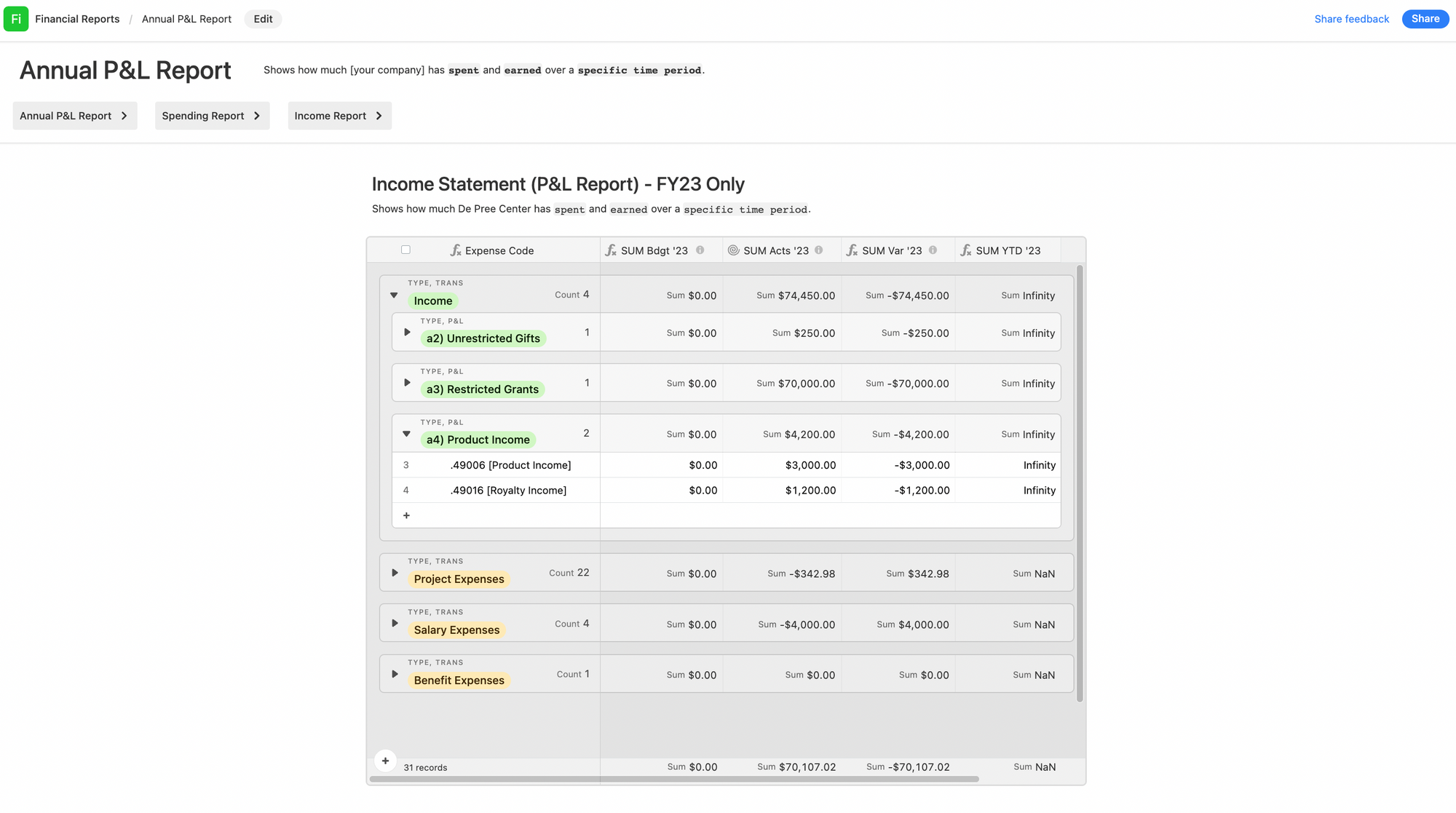 In 2019, Matsushima built a simple Airtable base for accounting and bookkeeping that’s been copied more than 1,000 times. He recently updated the base, adding room for multiple fiscal years, plus interfaces to show specific types of reports (an Annual Profit & Loss Report, for example, which shows how much your company has spent and earned over a certain period).