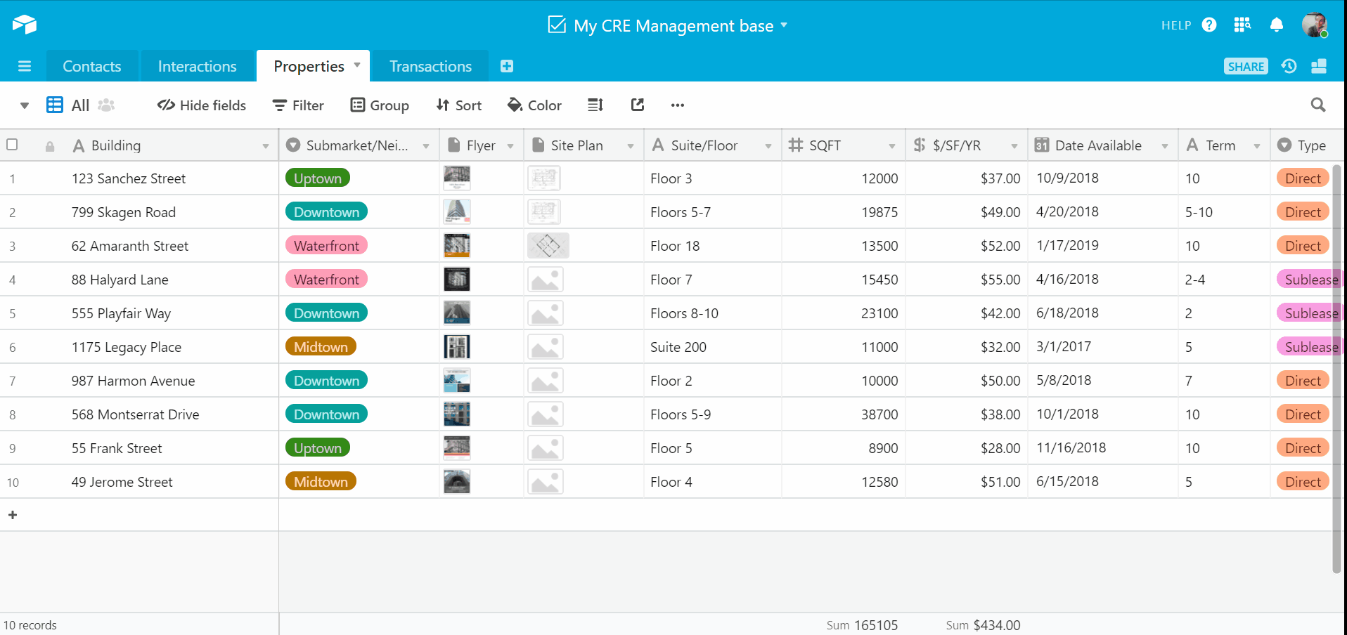 Airtable offers the power to centralize your entire CRE management workflow into a single source of truth—CRM included!—while giving you the flexibility to work in ways as unique as your business and clientele. Bases are fully customizable, living tools that allow you to store everything you need in your workflow but see only the information you want, when you want, in the way you want—it's the ideal transaction management tool, and the antidote to static, single-path CRE management solutions.