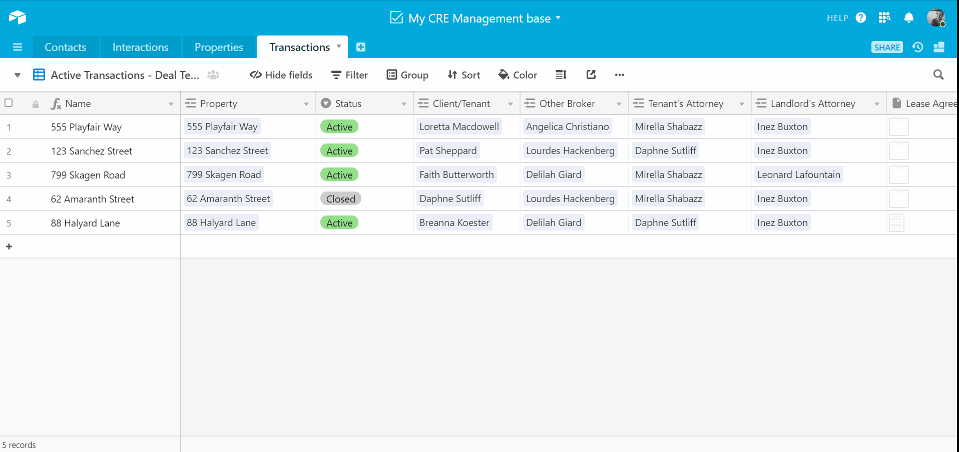 We can also hide fields and filter out unwanted records on our Transactions table to remove extraneous fields, allowing us to focus on the key elements of the deal at hand: the main players involved, documents needing a signature, a schedule of showings. Using a filter to home in on active listings is a great way to narrow your focus as you prioritize your time and attention.