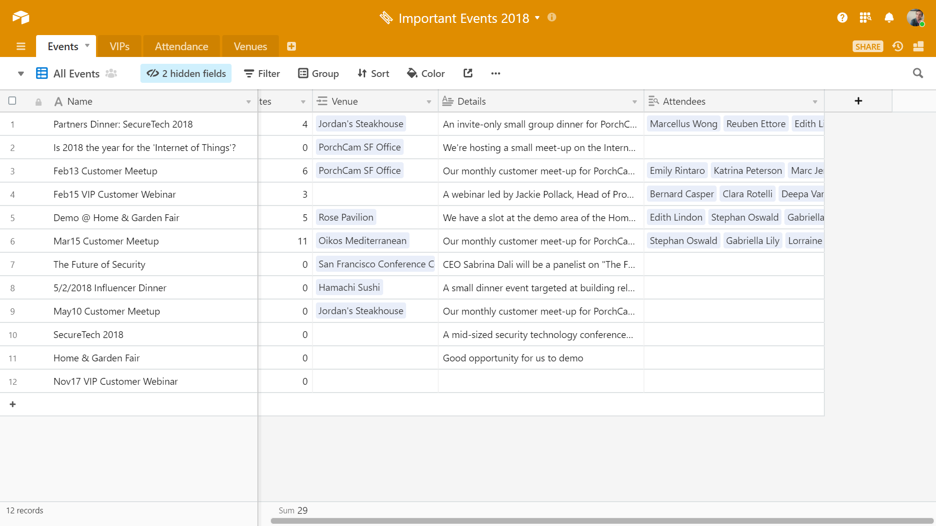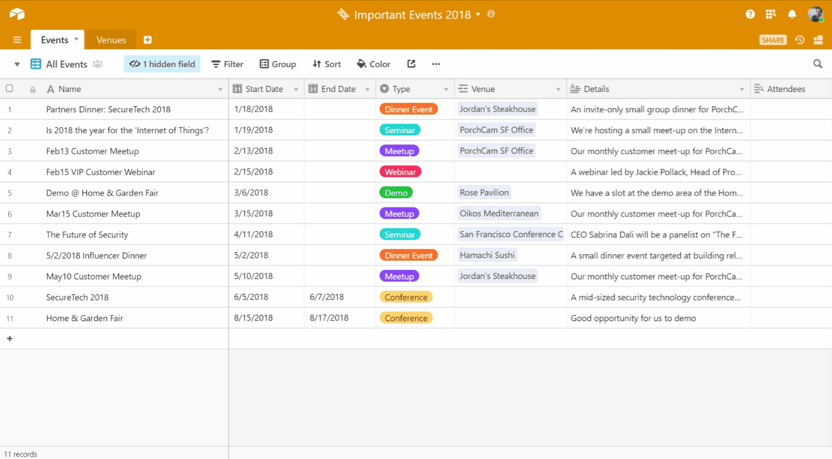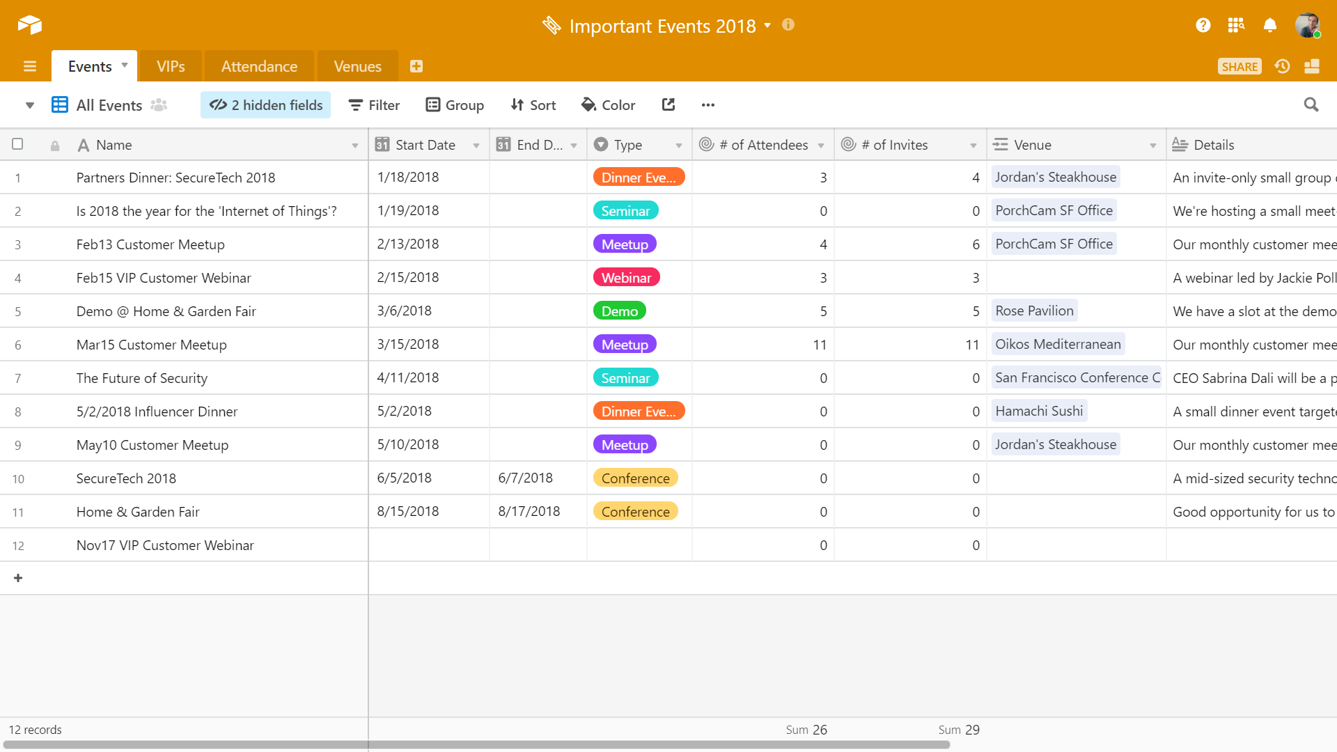 These are just some of the ways that contacts and interactions tables can assist with your event planning workflow. No more spreadsheet nightmares, no more "I should remember to…" moments—instead, you can enjoy the benefits of a single resource that keeps up with your planning needs.