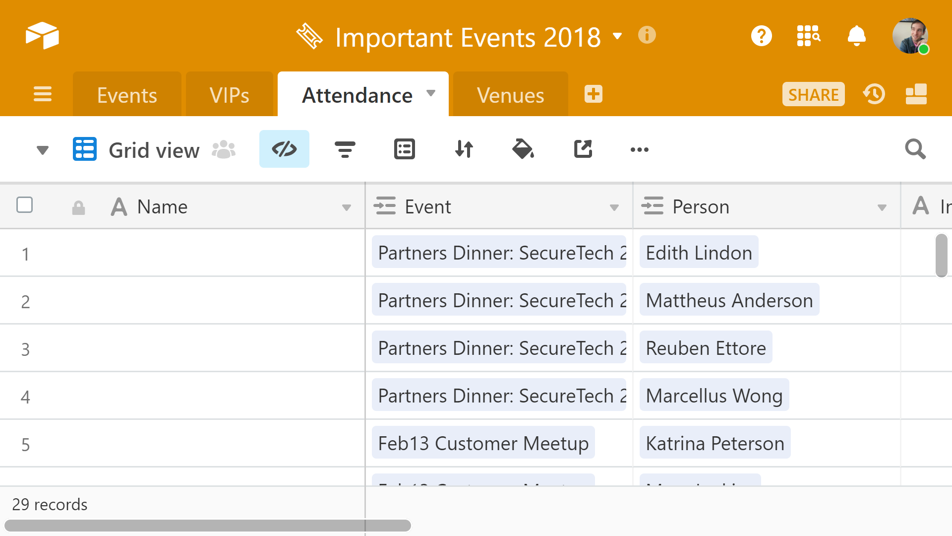 At a glance, we can see that most events for which we sent invitations have a 100 percent attendance rate. We can just as easily see the events with less than 100 percent attendance by comparing the two side-by-side. This data is useful for multiple reasons—it can help us identify which VIPs to reach out to, allow us to stay on top of attendance numbers as we receive RSVPs, and more. If we notice an especially important VIP is or is not attending, we can review the Notes field on the Attendance table for additional information, helping maintain a personal touch in our interactions.