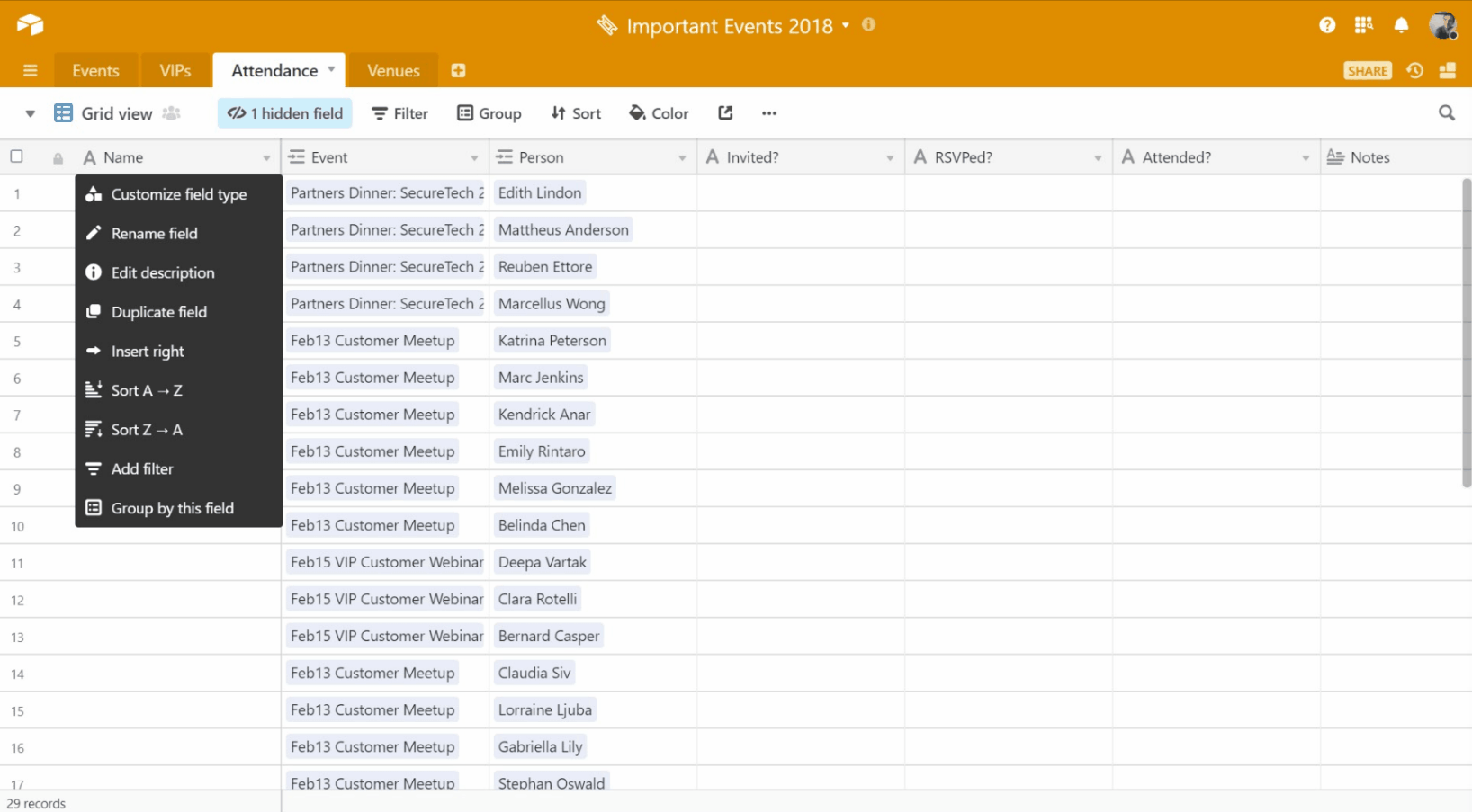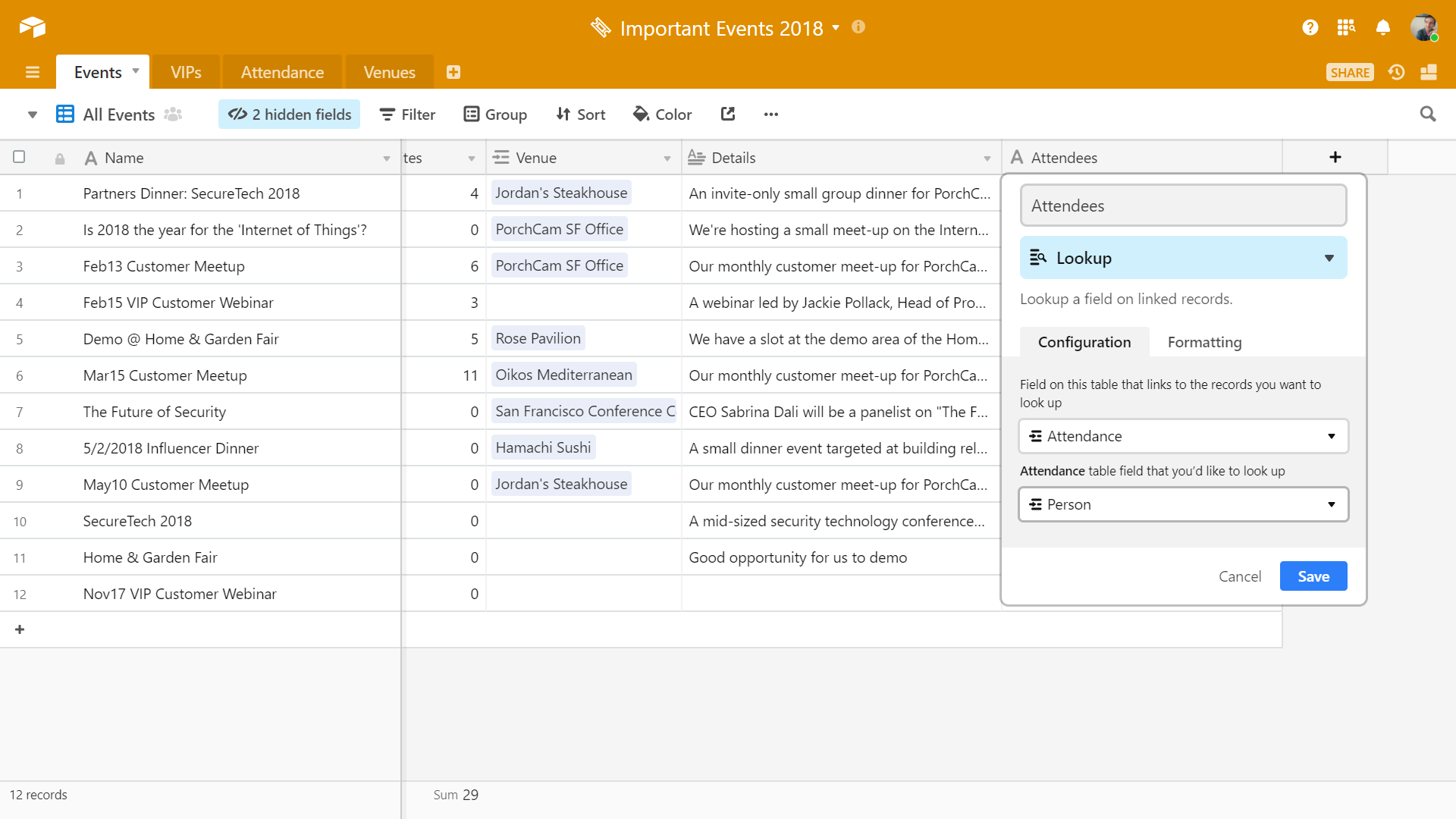 Some information, like attendees, is significant enough that we will want to see it in multiple tables throughout the base. A lookup field is a great way to pull information from one table to another, and it utilizes the links we have already created between tables. As a bonus, these fields will adjust themselves when information is changed in the looked-up field—no more wasted time identifying and reconciling discrepancies between countless tables.