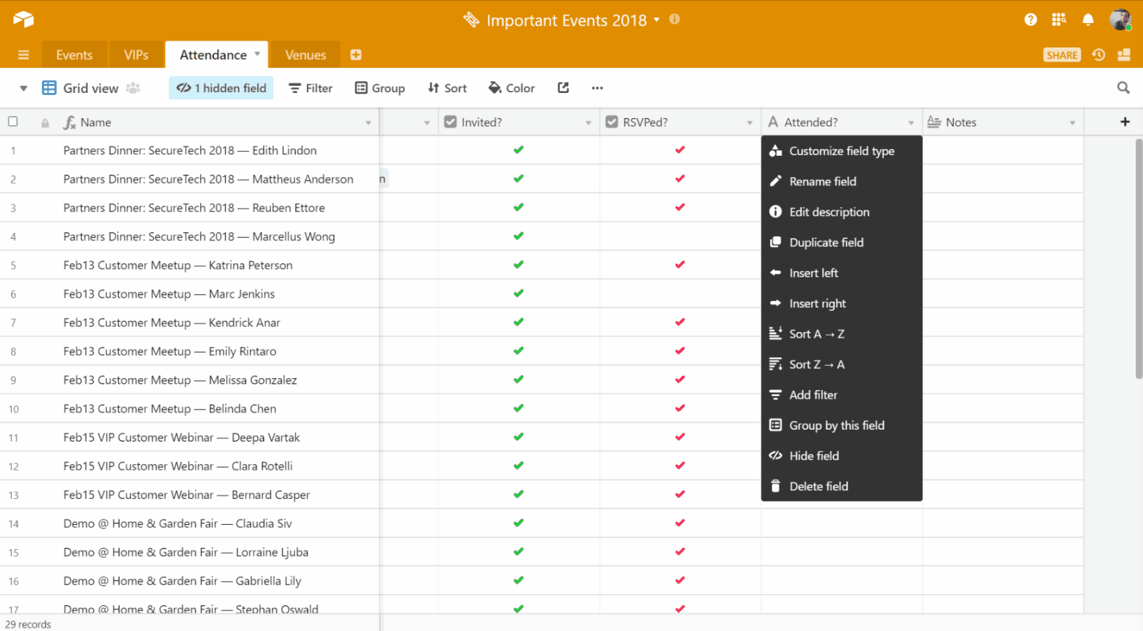 With both fields rolled up, we can easily compare the number of attendees to the number of total invites for a specific event; the headcount will automatically adjust as we update the respective fields, ensuring the information is always accurate and up-to-date.