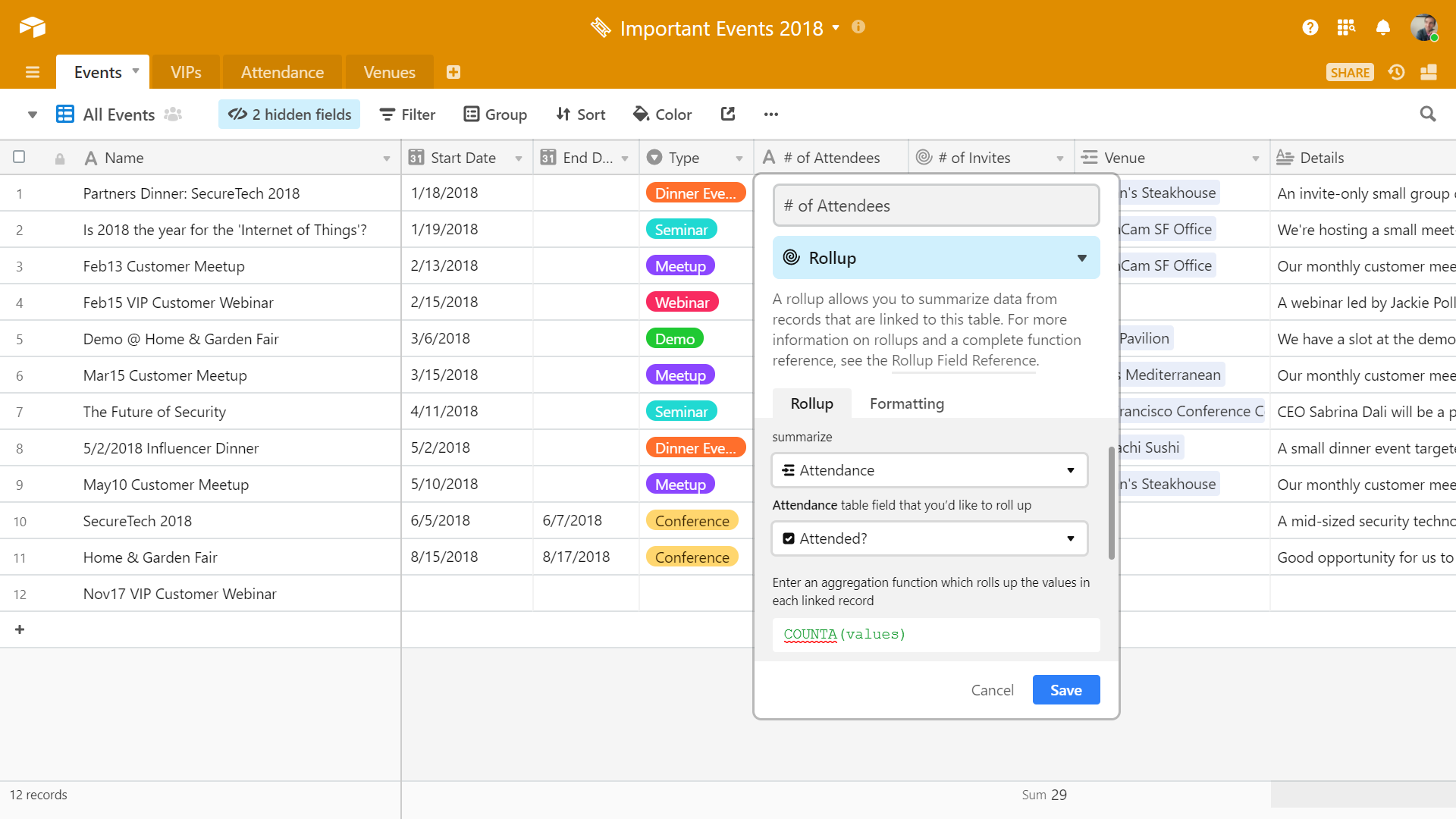 Our VIPs and Attendance tables now contain a great deal of interconnected information—we can augment that data using supplementary features (like rollups) to further customize these fields and glean additional insights. Rollups allow us to summarize data from records we have linked to a table—in our case, this feature would be especially useful for tracking the number of attendees and invites to a specific event.
