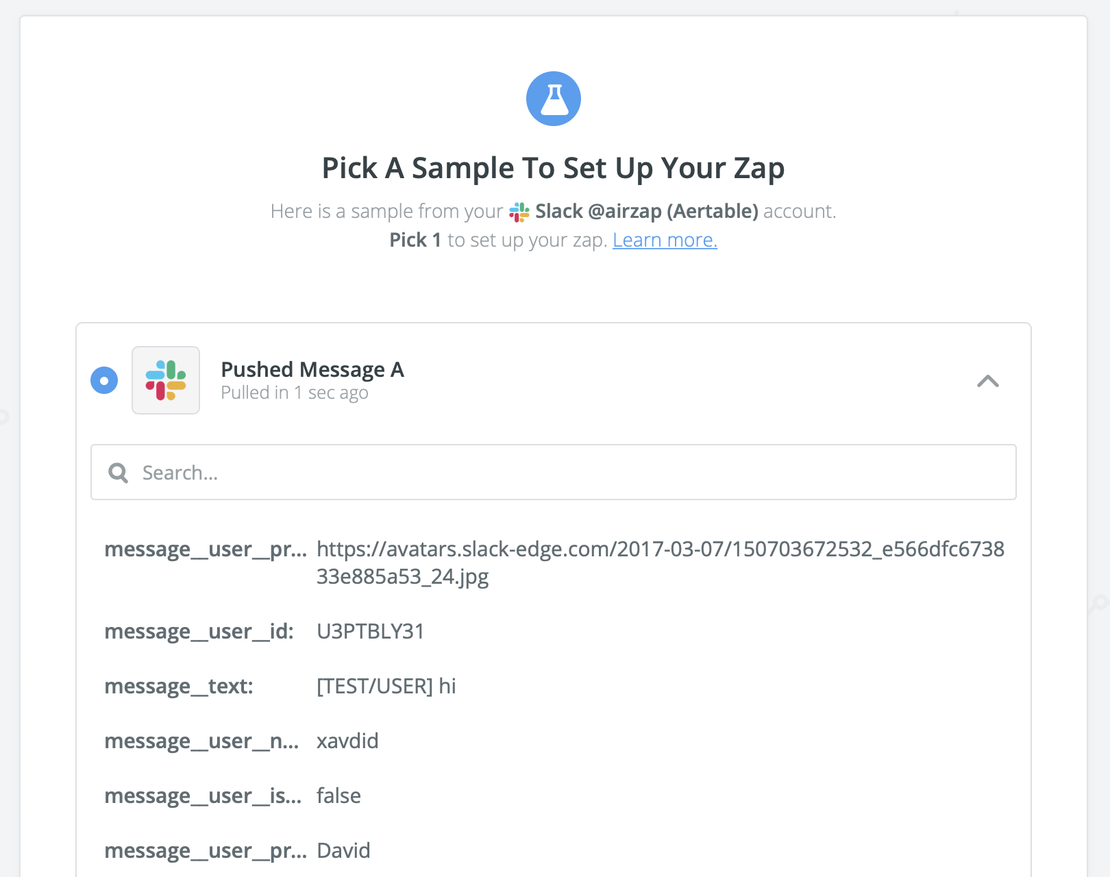 Back in Zapier, you'll find your message and its metadata. It will be labeled Pushed Message A (unless you've pushed multiple messages). Select it, click Continue, and you're done.