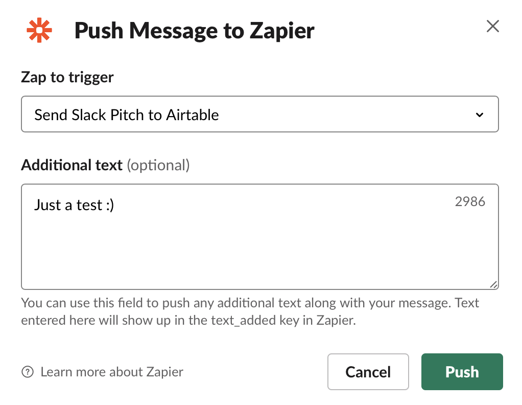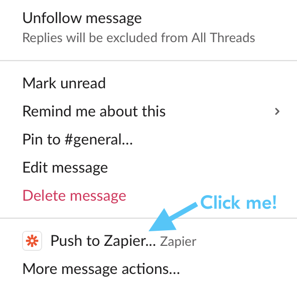 From there, create (or locate) a message in your connected Slack channels and click the ... (ellipsis) on its right side. This will display the contextual menu pictured above. Choose the Push to Zapier... option to bring up the next step.