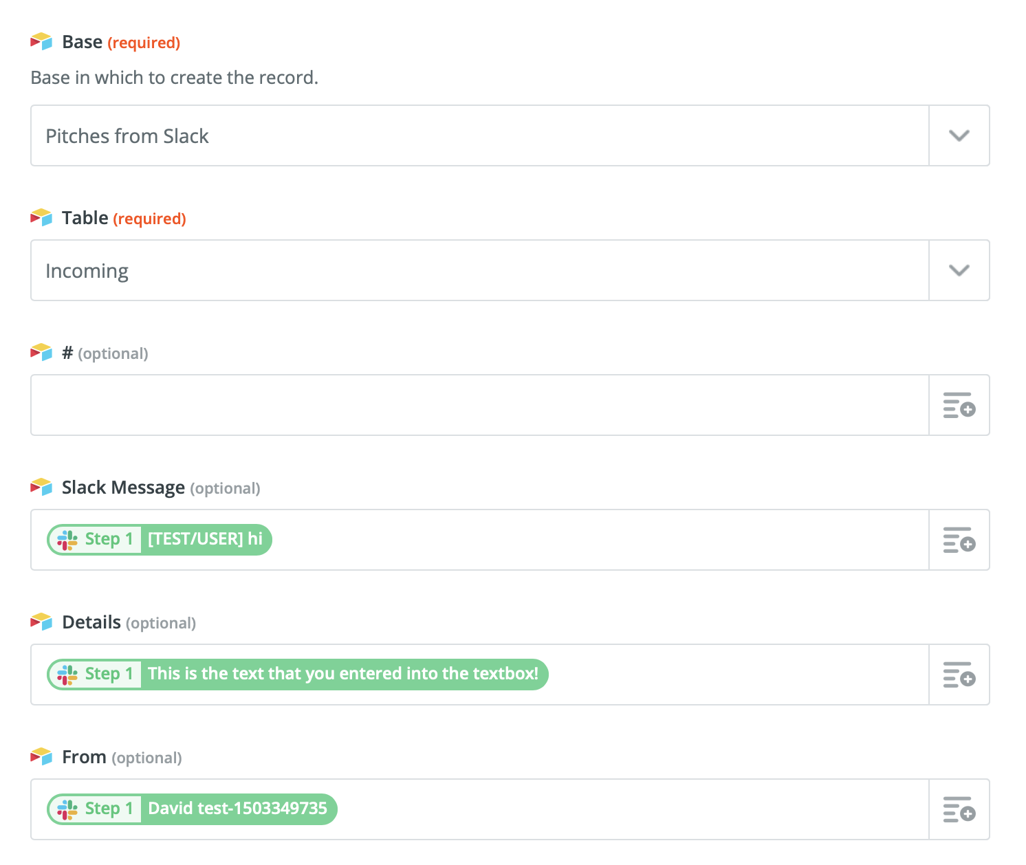 Once you do, Zapier will load all the available fields. To fill them out (similarly to the screenshot above) just click on the button at the end of each text field and choose the relevant information gathered from Slack in step one. For example, in the screenshot above you'll see the original message added to the Slack Message field, any additional details added to the Details field, and so on. Your version should be very similar if not identical.