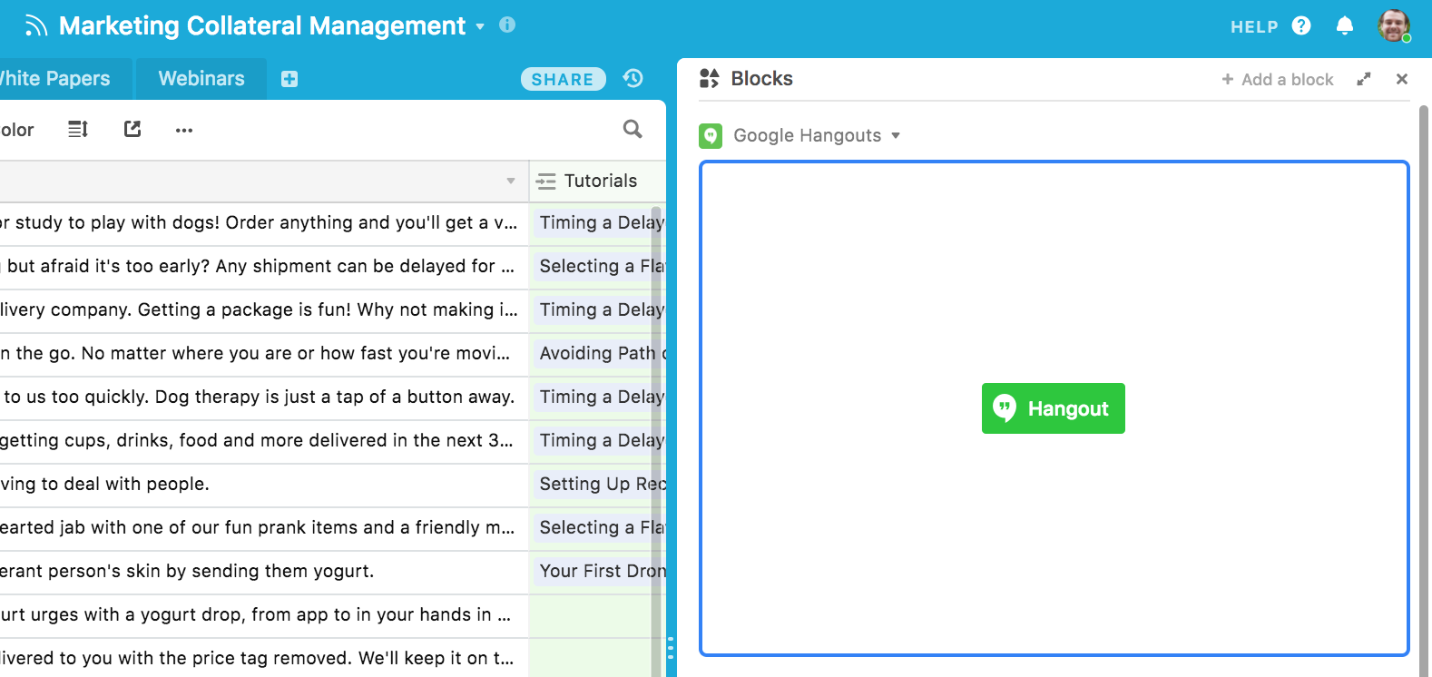 To enable better team-wide communication, you can add a Google Hangouts block to your base, creating a button with a unique link that everyone on your team can use to jump onto a group video chat.