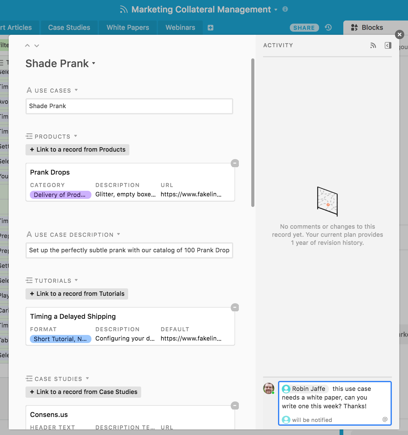 - Tables for your different kinds of marketing assets. Case studies, tutorials, white papers, webinars, and support articles should all get their own table. You can tailor the kinds of fields in each table to the sort of information each marketing asset contains—if it's a white paper, include an attachment field that contains the most recent version of that white paper; if it's a web page, include a URL field linking to that page.