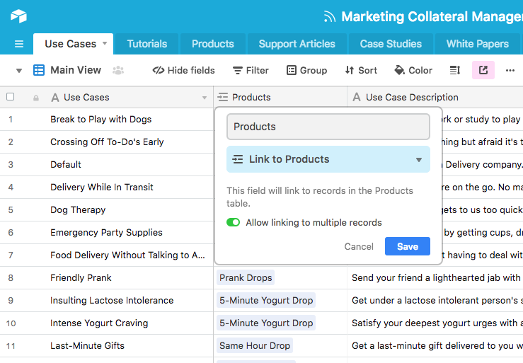 Once you have these two kinds of tables set up, you can use your use case table to its fullest by creating fields that link each use case to your relevant products and marketing assets. These linked record fields empower you to see at a glance which of your products are serving which use cases, and what specific tools you have for marketing each of those use cases.