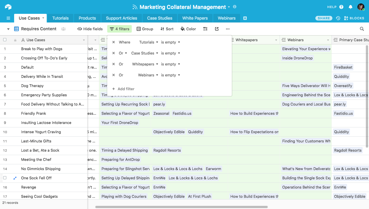 You can immediately see which of your use cases fail to meet these conditions and which therefore require content by creating a view of your Use Cases table and adding filters to that view so it will show any use cases that are lacking any one of those types of collateral.