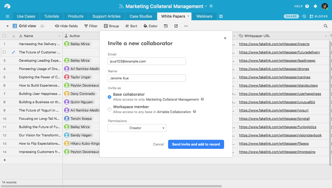 You can assign team members to the specific pieces of collateral for which they're responsible and directly notify them about their new assignments with collaborator fields. You also don't need to wait for people to sign up as collaborators to keep moving forward with your workflow—you can invite new team members to Airtable directly from a collaborator field. Say you've hired a freelancer to create some new marketing collateral, but they haven't signed up to be a collaborator on your base yet. Just input their name into a collaborator field on whatever assets you want them to complete—this will automatically add them as a collaborator and invite them to join the base without interrupting your work.