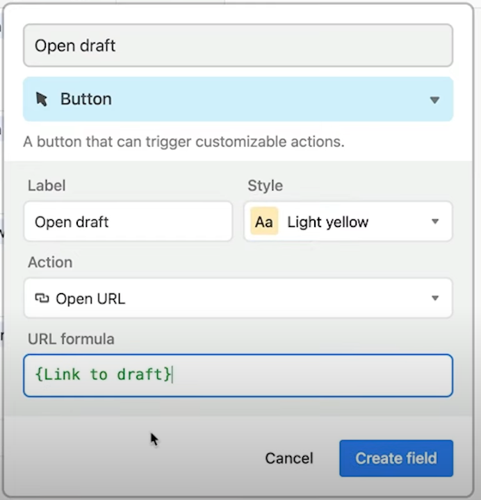 A formula can return the value/entry of a field just by using the field’s name, surrounded by curly brackets. So we connect the “Link to draft” field by entering the formula {Link to draft}. When you okay this, the button it creates will automatically pull the URL that’s entered from that record, and launch it.