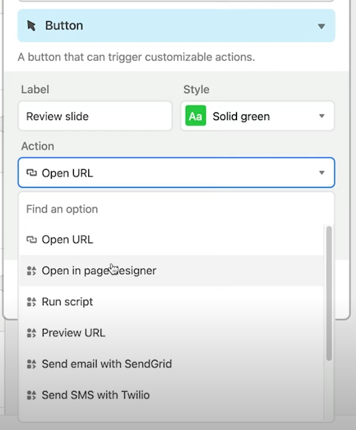 Here’s an example of how a button linked to a page designer layout can simplify a regular process, like adding weekly slide decks. Like before, we start by creating a button field and giving it a name, label, and color—then it’s time to pick an action.