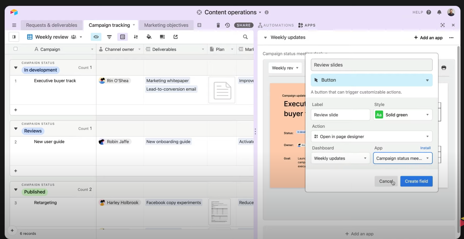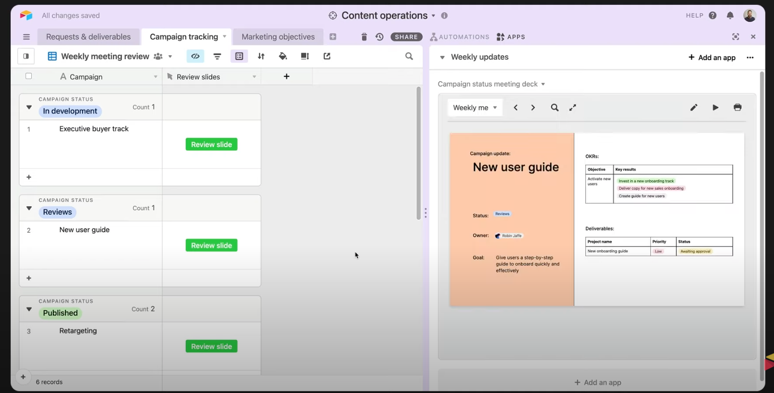 For example, we’ve created a weekly campaign meeting view above, with all the extraneous information stripped away and the button placed prominently. In this shared view, it’s clear for the team that the content needs reviewing–all they have to do is press the button to gain access.