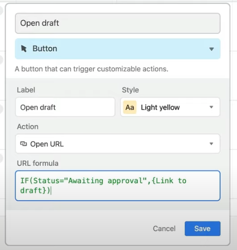 Say you only want drafts to be accessed when they’re finished and waiting for approvals. You can create a button that links out to the draft, but with a formula condition (see above) that only makes the button active when the record’s status is “awaiting approval.”