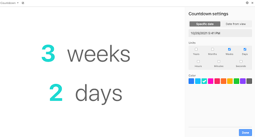 With the Countdown app (available to all Pro plan users), you can set the app to count down to a specific date, or to a date already listed in a view. The next step is to use the units section to specify whether you want to count down from years to weeks to hours… even seconds, if that’s what’ll keep you motivated. Finally, select a color for your countdown.