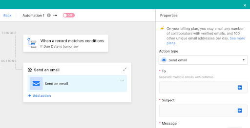 When you add a new automation, you'll be asked to set a trigger and an action. For the trigger, choose “when a record matches conditions” and set the due date to “tomorrow” (or one week from now… you decide). The action will be “send email,” which lets you add an email, subject, and message. Choosing Slack as your action lets you add a customized message and plug it into a channel. Now you’ll receive a helpful reminder in your inbox the day before a deadline, just in case.