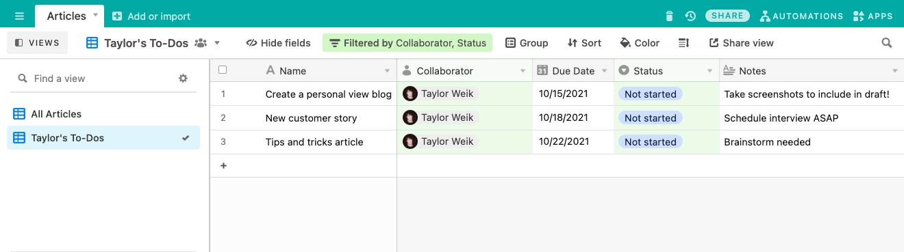 It can be a doozy to handle tasks when your base is filled to the brim with records. Having so much information in a base can be overwhelming; creating a view where you only see the tasks that you need to complete can keep you deadline-oriented.
