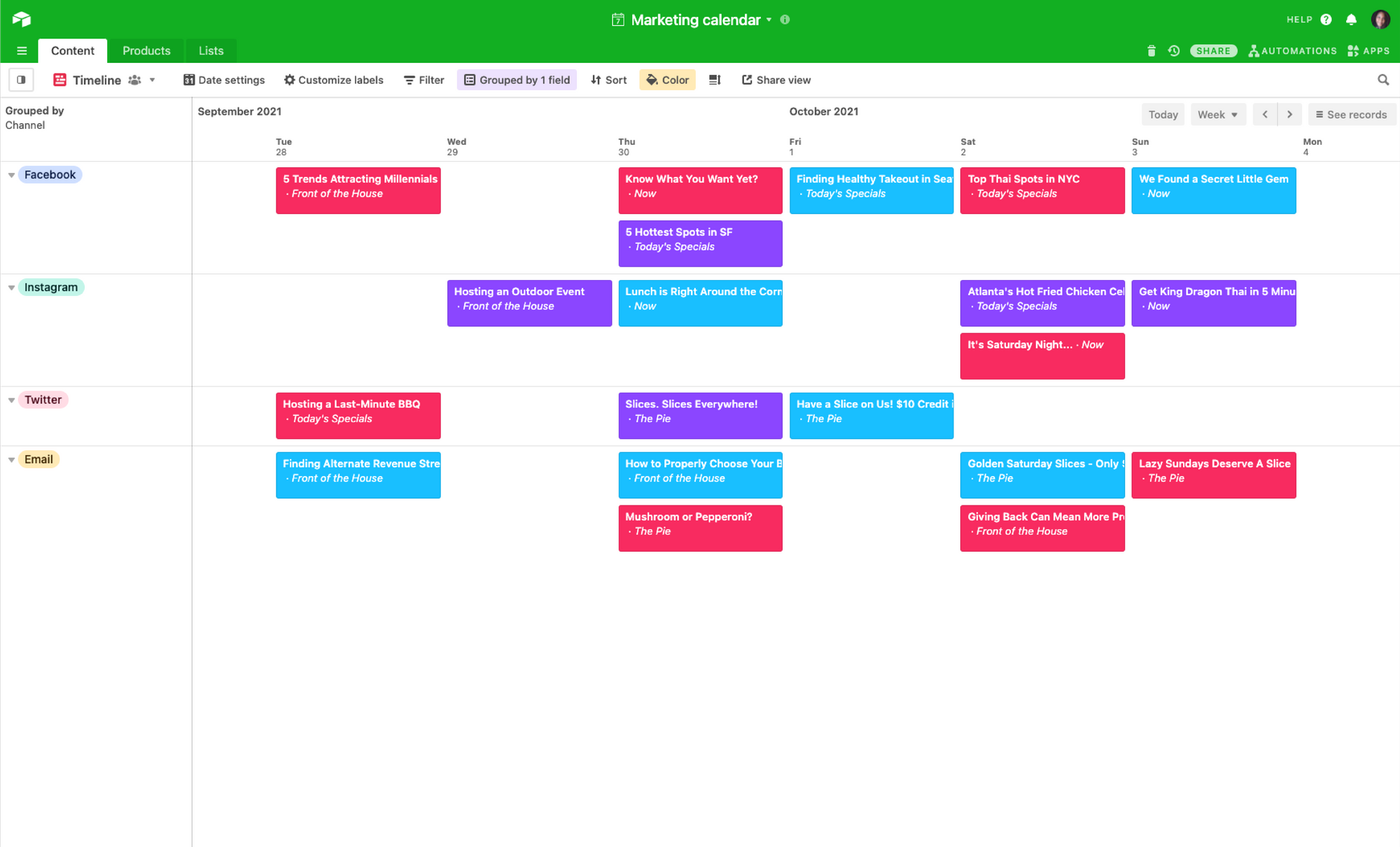 Our newest view groups records by fields and displays them neatly on a horizontal timeline, so your team can see what’s coming in the next day, week, or month. With Timeline view, you can check each team members’ weekly workload, schedule your content to run on certain days, color-code your data based on importance, and much, much more.