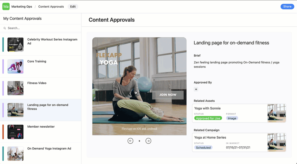 This layout helps triage or review many records simultaneously, like approving assets for an upcoming campaign, assigning resources for a major initiative, or reviewing customer feedback.