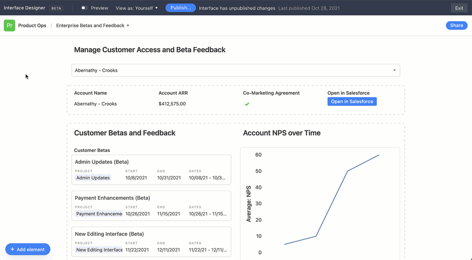 But whether you’re helming a Fortune 500 or running a mom-and-pop shop, we think Interface Designer will be essential for your business. So today, we’re making the beta available to every user on Airtable, regardless of plan. We’d love your feedback—and rest assured, anything you build in the beta will be yours to keep as we move toward general release.